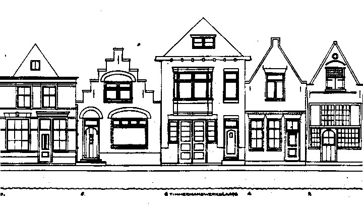 Het middelste huis is de woning en timmermanswerkplaats van Pieter Hobbelman in Hoorn, omstreeks 1860